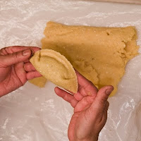 To the ground corn adds salt. Knead the dough until it is thoroughly mixed and form a firm ball. Pick off small pieces and form into the size of small balls. Flatten each piece thin, with the help of a piece of plastic and a rolling pin. Put about 1 spoonful of the meat mixture in the centre of the flattened ball, depending on how big you would like to make them. Fold over and pinch edges together to close and form a pretty edge, using a cup, form a half moon, cut it, put them in the fridge, until you are ready to fry. Place in deep, hot vegetable oil and fry about 3 or 4 minutes until golden brown. Remove and put on paper towels in a colander. Serve immediately or reheat in a paper bag in the oven prior to using. The meat mixture can be made in advance and stored in the freezer, but the dough must be made fresh the day of use.
